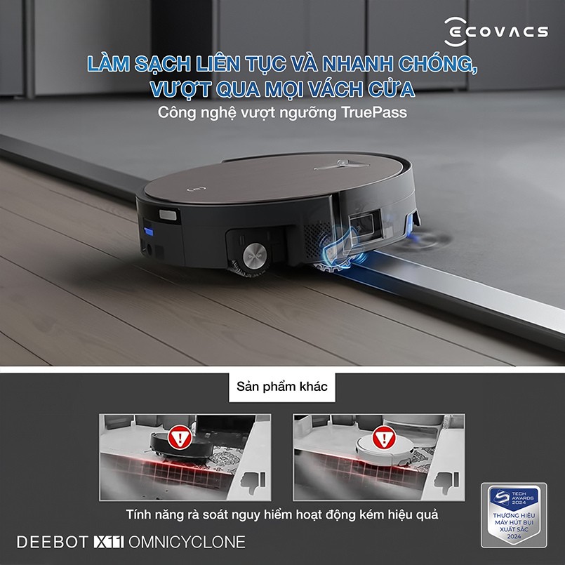 Ecovacs DEEBOT X11 OmniCyclone được trang bị công nghệ TruePass thế hệ mới với hệ thống leo dốc cơ khí 4 bánh tiên tiến, cho phép robot dễ dàng vượt qua hầu hết các ngưỡng cửa và chướng ngại vật trong nhà. Trong trường hợp gặp bậc cao, X11 OmniCyclone sẽ lập tức kích hoạt hai bánh xe phụ với răng bám cao su mềm, tạo lực bám chắc chắn để nâng khả năng vượt ngưỡng lên tới 2,4 cm cho ngưỡng đơn và 4 cm cho hai ngưỡng liên tiếp – điều mà hầu hết robot thông thường khó có thể xử lý.