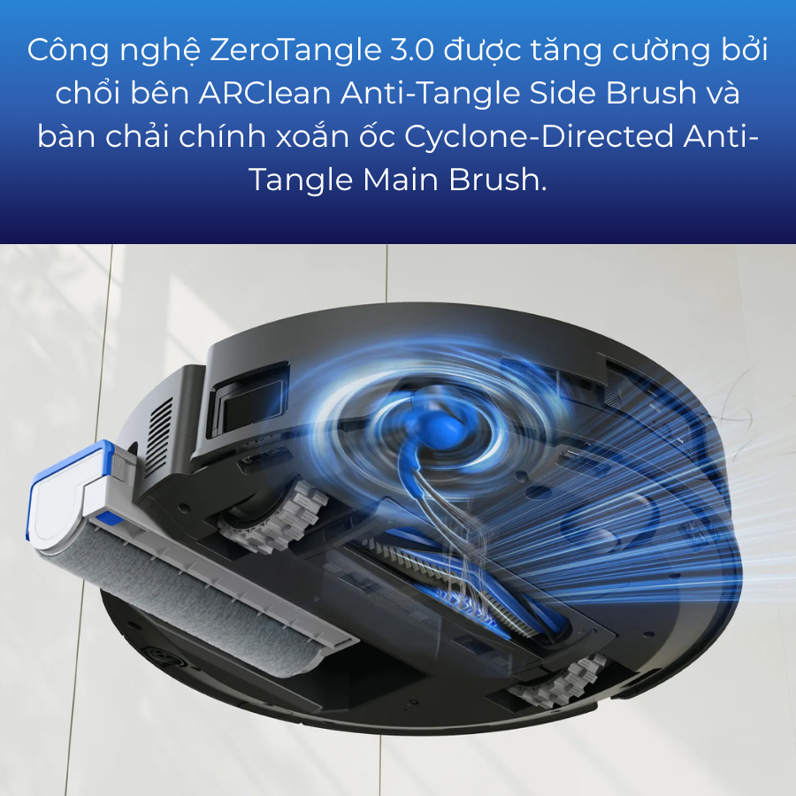 Công nghệ ZeroTangle 3.0 của Ecovacs X9 Pro Omni là phiên bản thế hệ thứ 3, được tăng cường bởi chổi bên ARClean Anti-Tangle Side Brush và bàn chải chính xoắn ốc Cyclone-Directed Anti-Tangle Main Brush, mang đến trải nghiệm dọn dẹp hoàn toàn không bị rối tóc hay mắc phải bất cứ mảnh vụn.