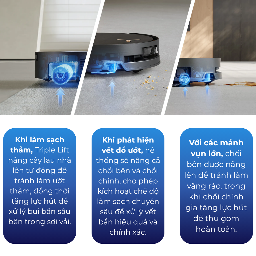 Khi làm sạch thảm, Triple Lift nâng cây lau nhà lên tự động để tránh làm ướt thảm, đồng thời tăng lực hút để xử lý bụi bẩn sâu bên trong sợi vải.