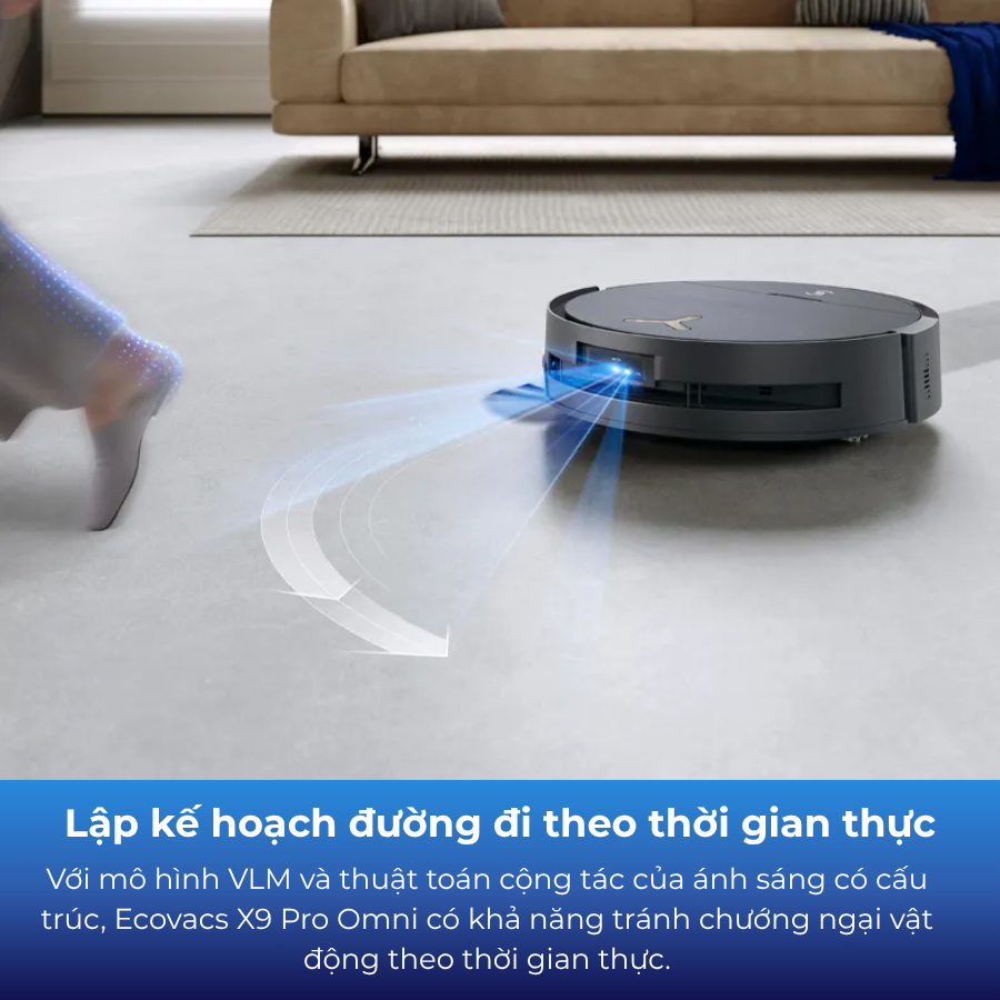 Với mô hình VLM và thuật toán cộng tác của ánh sáng có cấu trúc, Ecovacs X9 Pro Omni có khả năng tránh chướng ngại vật động theo thời gian thực. Nó có thể phản ứng ngay lập tức với những thay đổi đột ngột của môi trường, chẳng hạn như người hoặc động vật di chuyển ở phía trước, đồ đạc thay đổi hoặc cửa đóng mở, điều chỉnh đường đi của nó cho phù hợp dựa trên những thay đổi này.