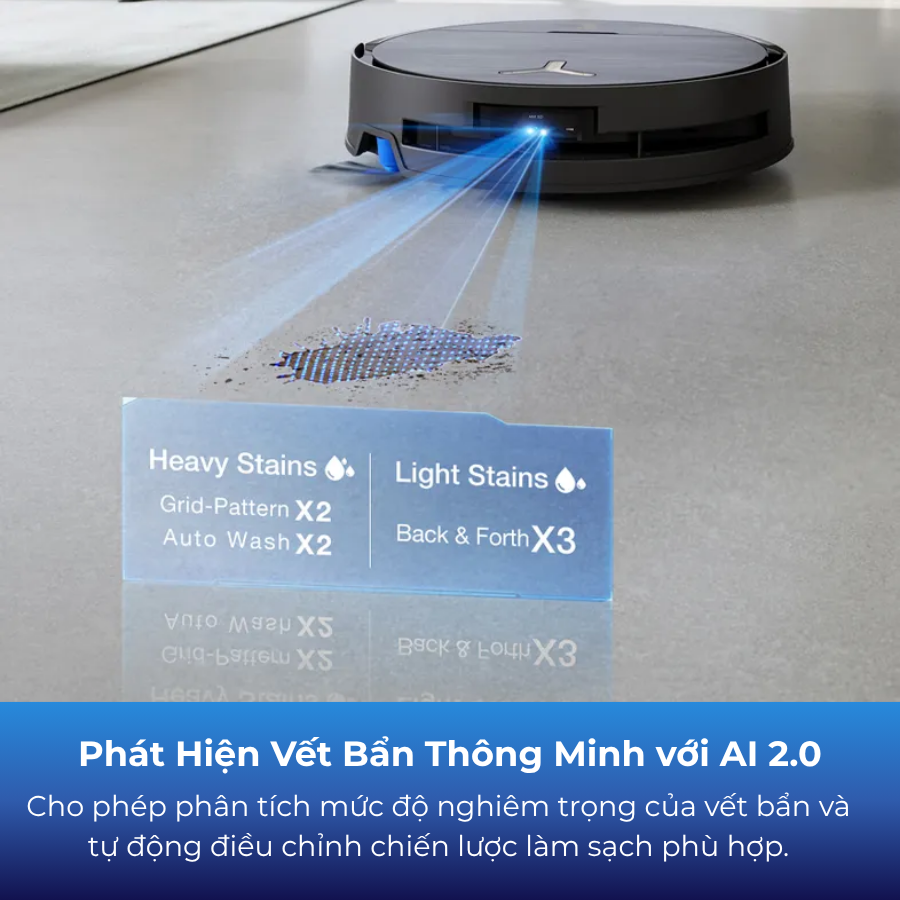 Ecovacs X9 PRO OMNI được trang bị công nghệ AI 2.0 nhận diện vết bẩn, cho phép phân tích mức độ nghiêm trọng của vết bẩn và tự động điều chỉnh chiến lược làm sạch phù hợp.