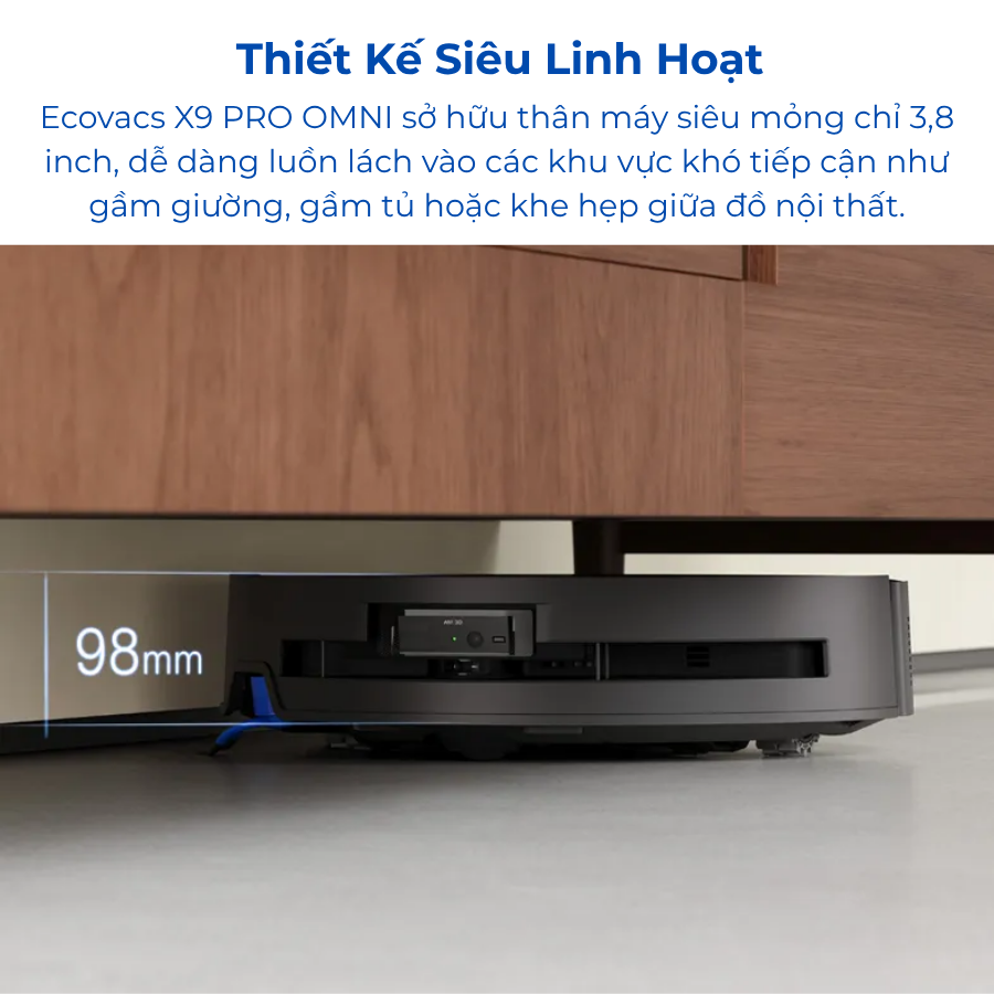 Nhờ cấu trúc tối ưu hóa toàn diện kết hợp với cảm biến radar nhúng, Ecovacs X9 Pro Omni sở hữu thân máy siêu mỏng chỉ 3,8 inch, dễ dàng luồn lách vào các khu vực khó tiếp cận như gầm giường, gầm tủ hoặc khe hẹp giữa đồ nội thất.