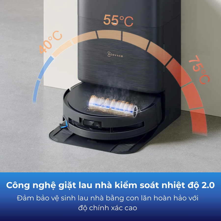 Với công nghệ giặt lau nhà kiểm soát nhiệt độ 40-75°C, Ecovacs X9 Pro Omni có khả năng tự động điều chỉnh nhiệt độ giặt lau nhà theo loại phòng và mức độ bẩn, đồng thời các vòng giặt có thể được điều chỉnh cho phù hợp. Ecovacs X9 Pro Omni còn tận dụng độ chính xác về nhiệt, cùng với hệ thống tối ưu hóa sức mạnh làm sạch, đánh bay mọi bụi bẩn sót, từ bụi bẩn cứng đầu đến bụi nhẹ, hòa tan cặn bẩn mà không làm bề mặt bị quá tải.