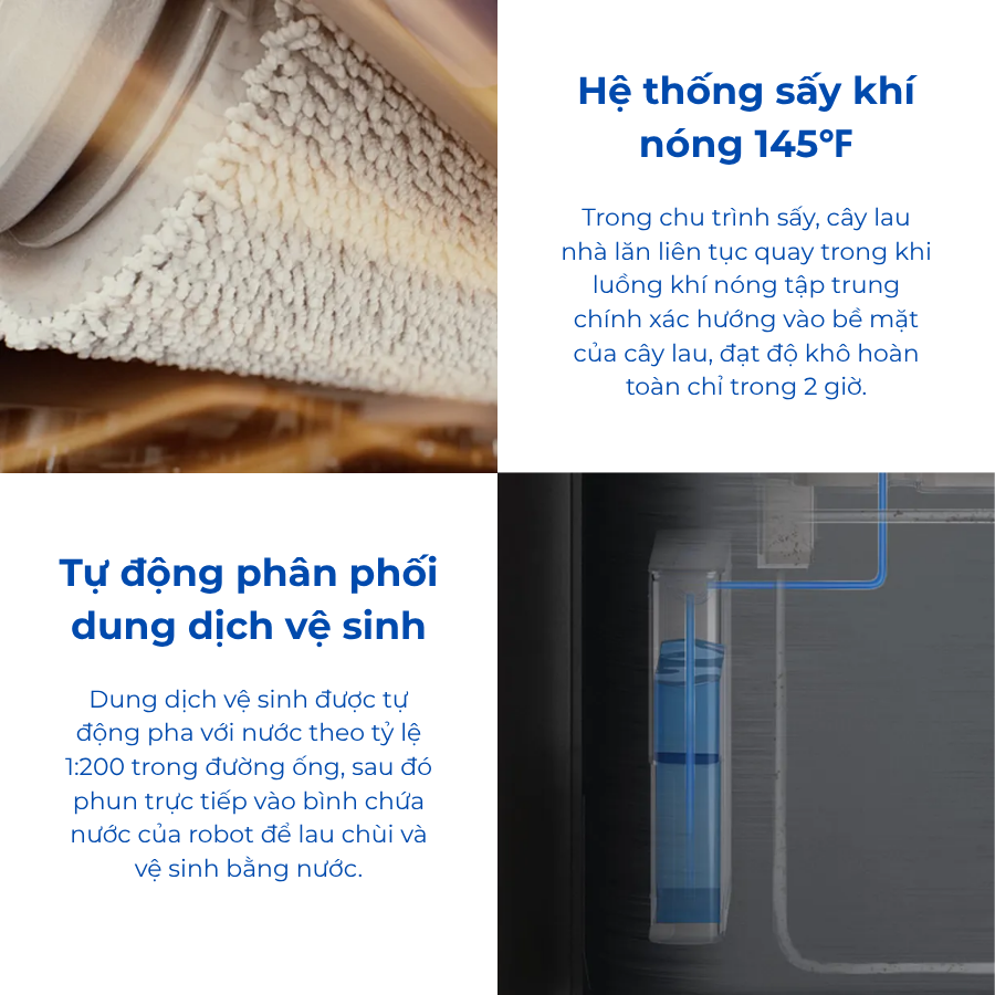 Dung dịch vệ sinh được tự động pha với nước theo tỷ lệ 1:200 trong đường ống, sau đó phun trực tiếp vào bình chứa nước của robot để lau chùi và vệ sinh bằng nước.