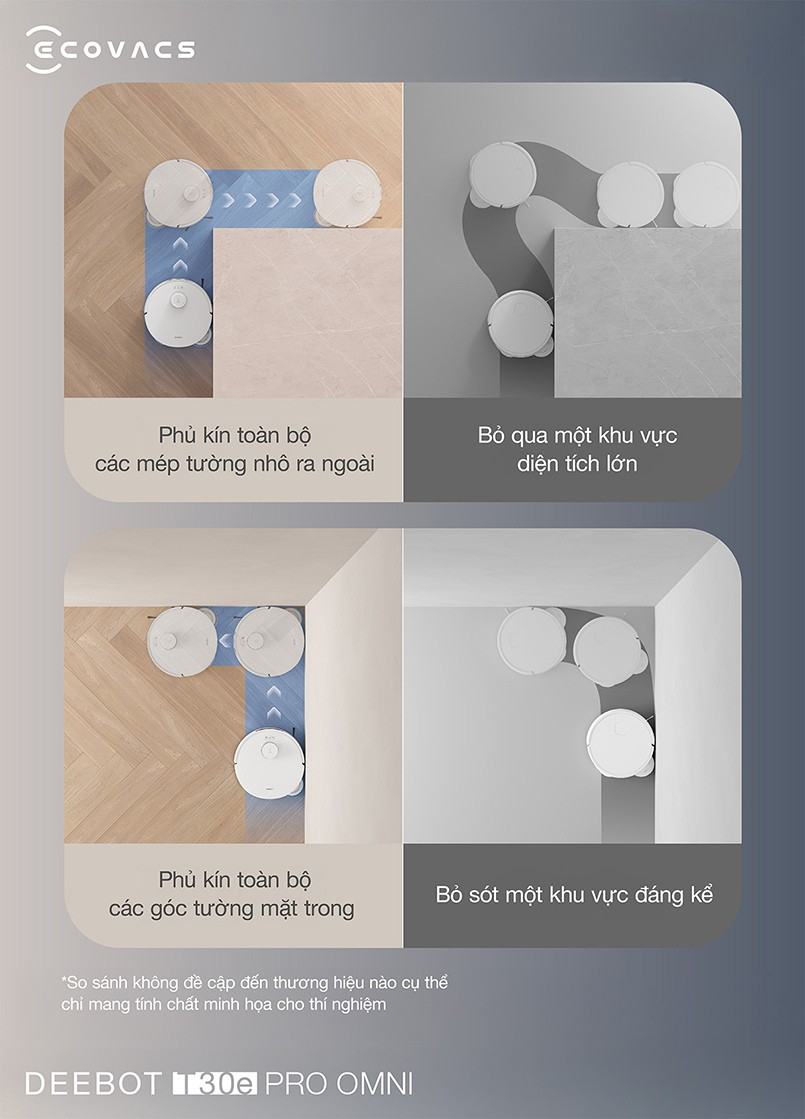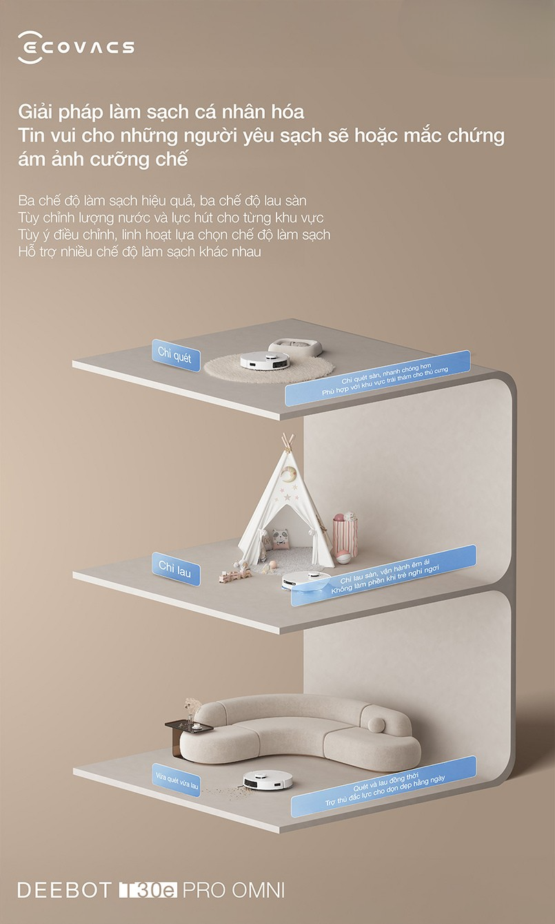Tính năng này không chỉ nâng cao hiệu quả làm sạch mà còn giúp người dùng tiết kiệm thời gian và công sức, mang lại trải nghiệm vệ sinh tiện lợi và hiện đại với Ecovacs Deebot T30 Pro Omni – Bản quốc tế.