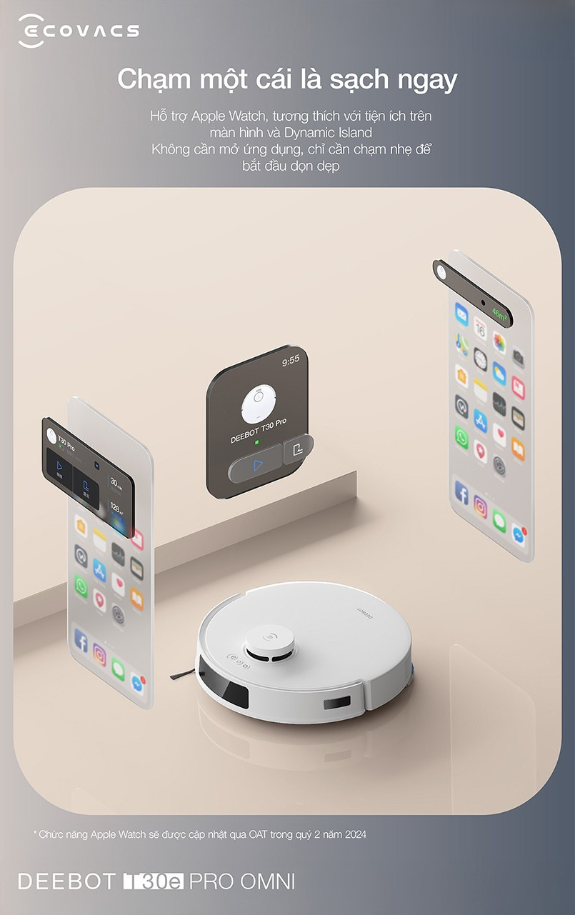 Ecovacs Deebot T30e Pro Omni mang đến trải nghiệm điều khiển thông minh và cá nhân hóa, giúp việc dọn dẹp trở nên đơn giản và linh hoạt hơn bao giờ hết. Chỉ cần đặt robot tại khu vực có vụn thức ăn hay nước đổ và nhấn nút, sàn nhà sẽ được làm sạch nhanh chóng, trả lại không gian gọn gàng, sạch sẽ ngay tức thì. Đặc biệt, Deebot T30e Pro Omni hỗ trợ Apple Watch và tương thích với tiện ích màn hình (Dynamic Island), cho phép bạn điều khiển robot chỉ với một chạm nhẹ mà không cần mở ứng dụng. Nhờ đó, bạn có thể bắt đầu dọn dẹp mọi lúc, mọi nơi, tận hưởng sự tiện lợi và rảnh tay hoàn toàn trong từng trải nghiệm.